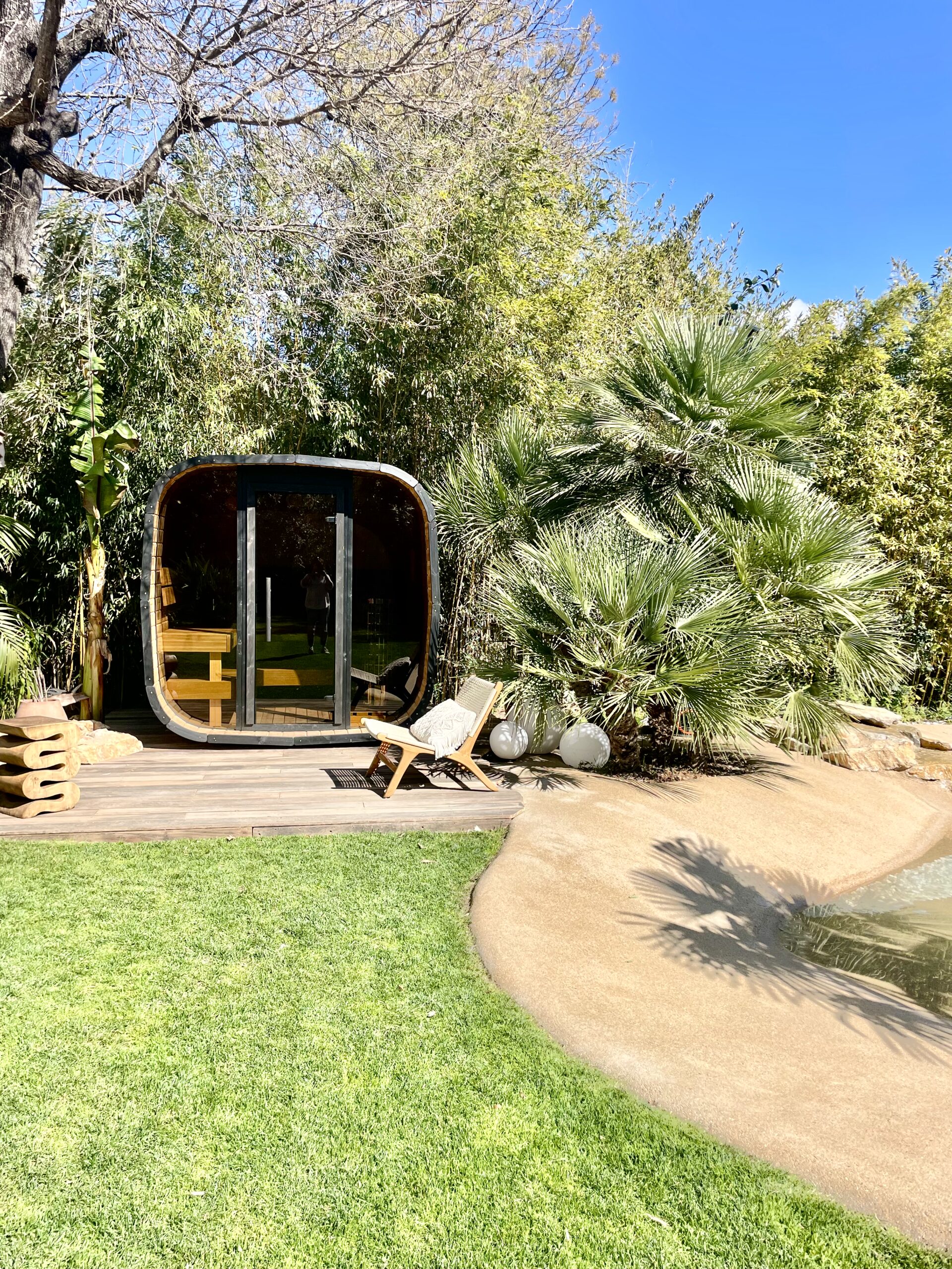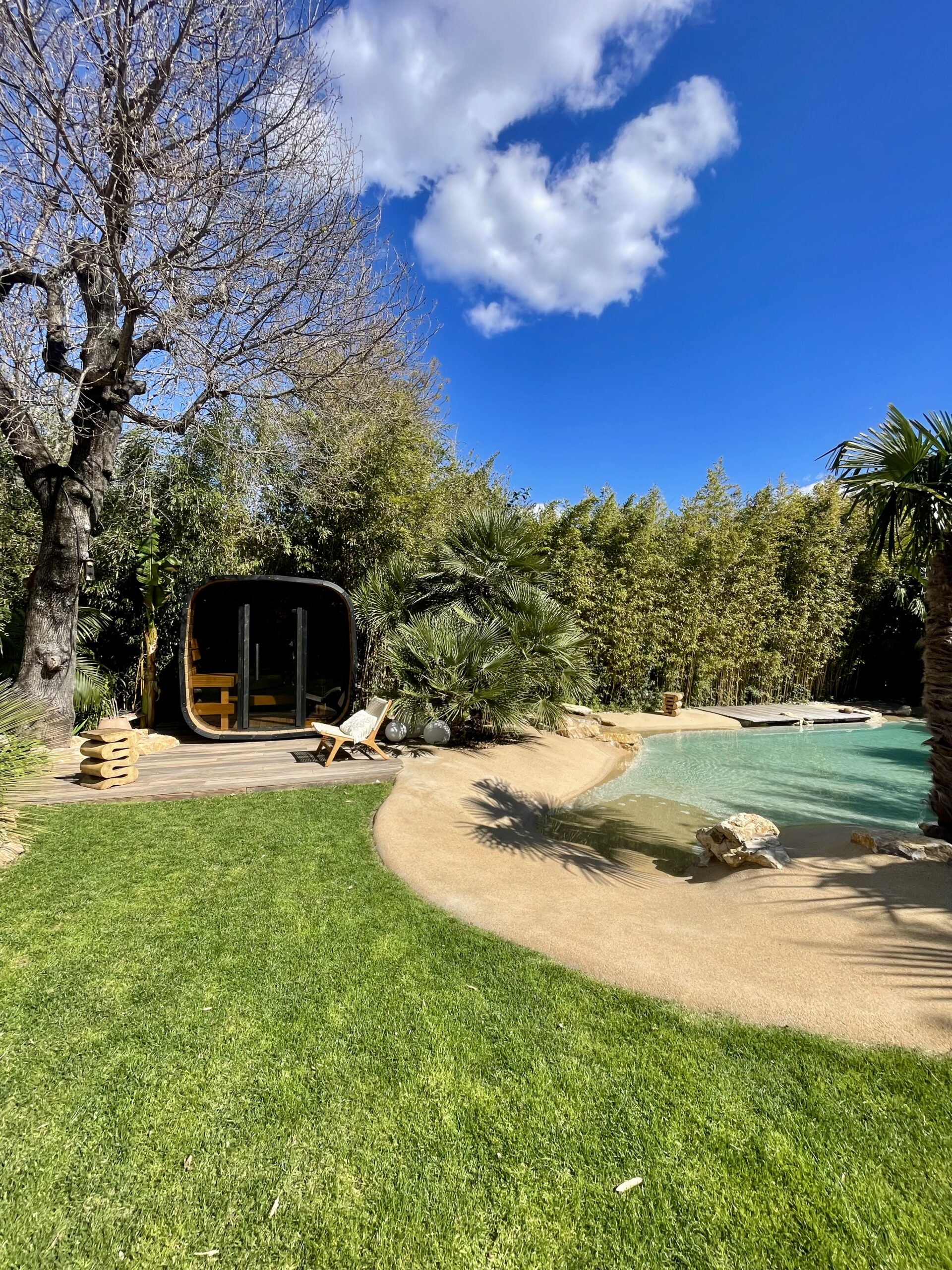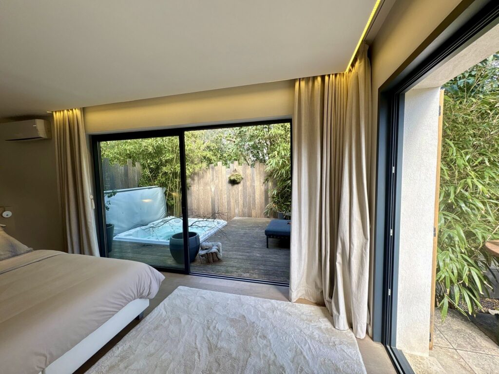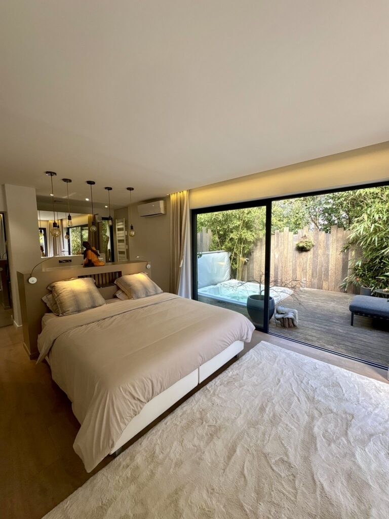 À l’extérieur, laissez-vous séduire par une somptueuse piscine lagon bordée de terrasses ensoleillées, tandis que le jacuzzi invite à la détente absolue. Un sauna privé complète cet espace bien-être pour une expérience digne d’un hôtel de luxe, au cœur d’un environnement calme et naturel.