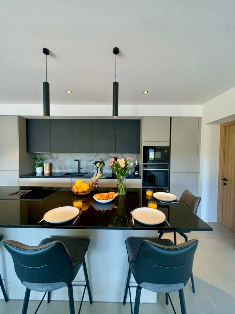 La cuisine, résolument design et parfaitement équipée, ravira les amateurs de gastronomie : électroménager premium, cave à vin, et pièce attenante façon garde-manger avec machine à laver et sèche-linge. Ouverte sur un élégant salon-séjour avec grande table à manger, elle crée un espace de vie convivial et chaleureux. Les larges baies vitrées effacent les frontières entre intérieur et extérieur et offrent une vue magnifique sur le jardin d’inspiration balinaise.